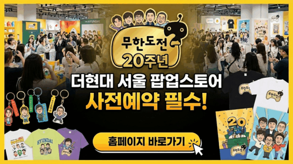 무한도전 20주년 팝업스토어가 더현대 서울에서 열립니다. 2025년을 맞아 돌아온 무한도전 팝업은 20년간 사랑받은 추억의 콘텐츠를 한자리에서 만날 수 있는 특별한 기회입니다. 사전예약부터 현장 예약, 한정판 굿즈 구매, 가족 및 어린이 동반 입장 정보까지, 이 글에서는 무한도전 팝업스토어 방문에 필요한 모든 정보를 상세히 안내해 드립니다.